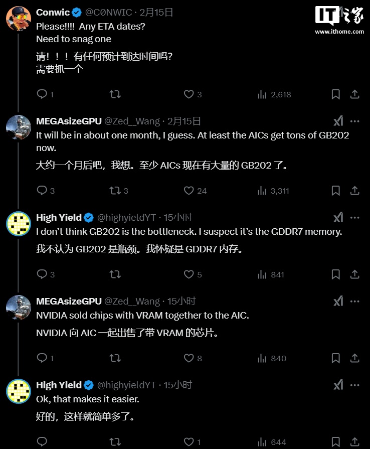 该爆料人还称,大约一个月后会有大量供应,英伟达显卡 AIC 厂商目前已有大量 GB202 GPU,并且带有显存。