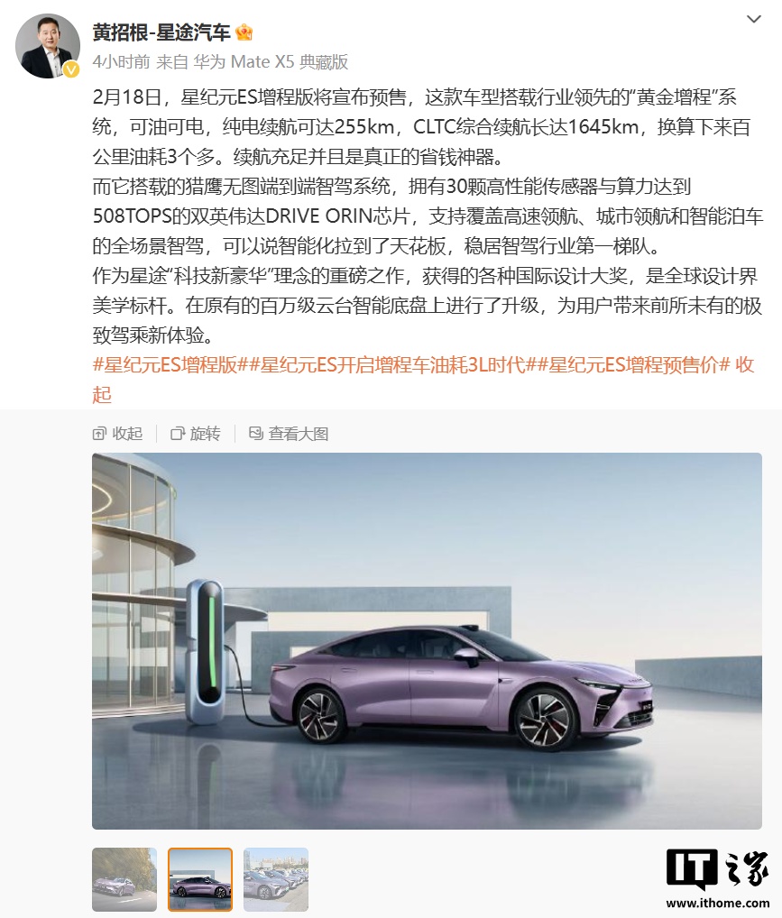 IT之家注意到,星途营销中心总经理黄招根今日发文透露,星纪元 ES 增程版车型可油可电,纯电续航可达 255km、CLTC 综合续航达 1645km。
