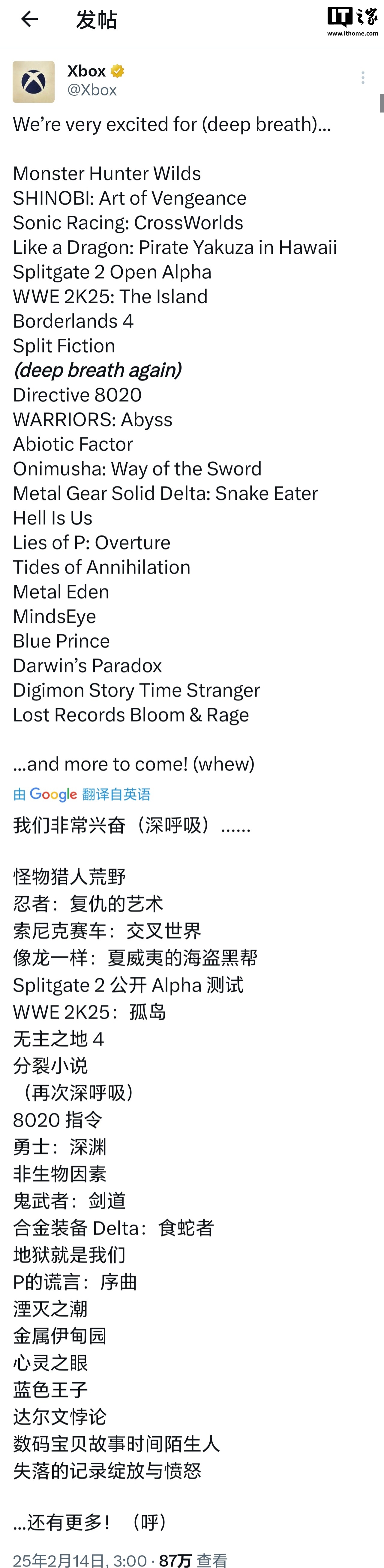 IT之家 2 月 16 日消息,微软 Xbox 官方账号本周(2 月 14 日)发文公布了一批即将上线的游戏名单,其中包括《怪物猎人:荒野》《人中之龙8外传》《无主之地 4》《湮灭之潮》等。