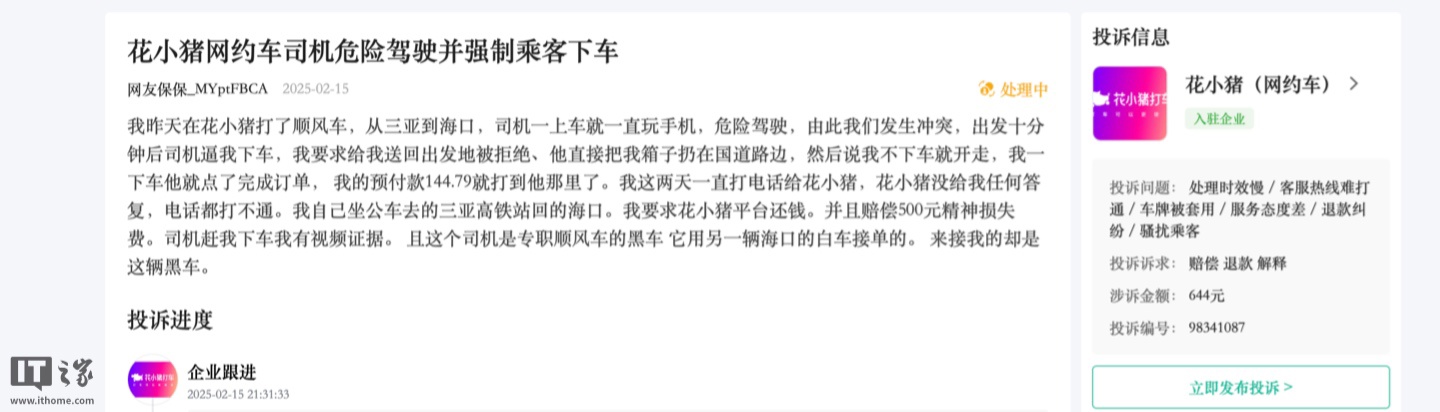 IT之家 2 月 17 日消息,近期,有用户在短视频平台及网络投诉平台 【下载黑猫投诉客户端】反映其通过花小猪网约车 App 下单三亚到海口的顺风车订单,乘车后司机一直在玩手机,乘客在行驶过程中多次提醒司机不能开车同时操作手机,结果司机反而恼羞成怒将其赶下车。