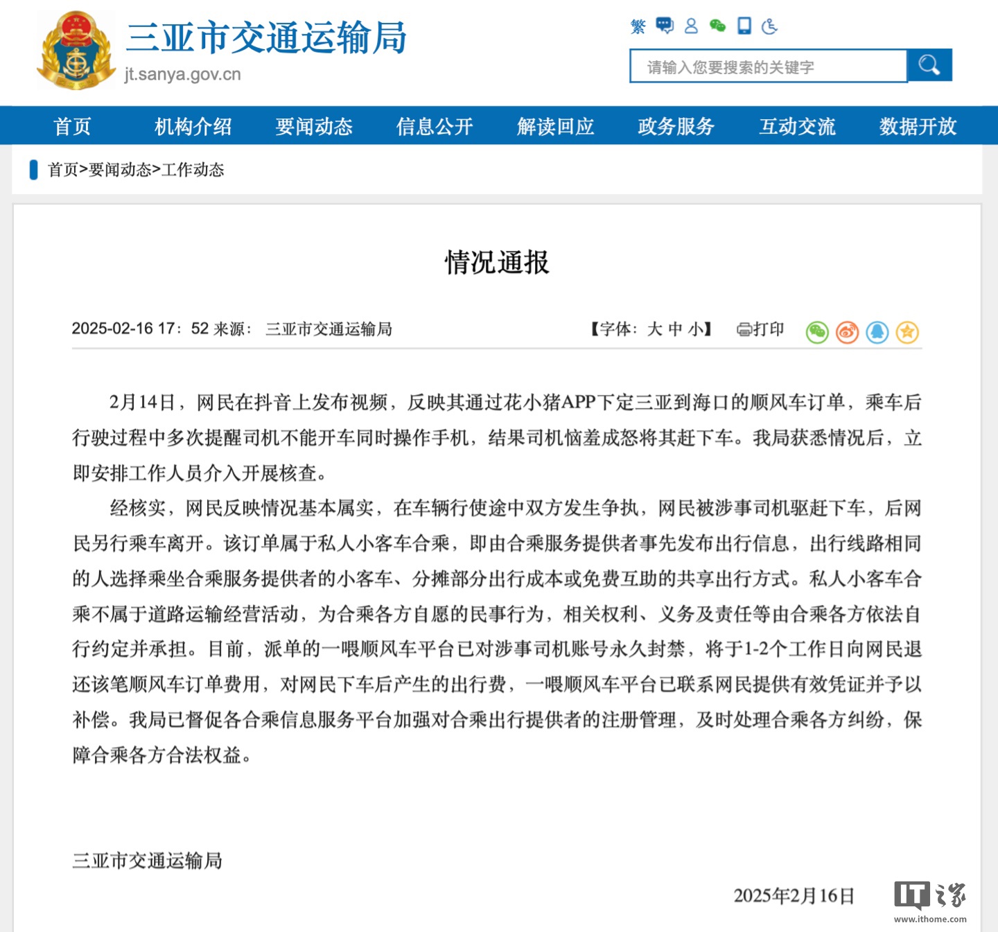 目前,三亚市交通运输局对此发布通报,IT之家获悉,通报称相应用户反映情况基本属实,在车辆行驶途中双方发生争执,网民被涉事司机驱赶下车,后网民另行乘车离开。