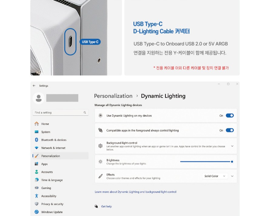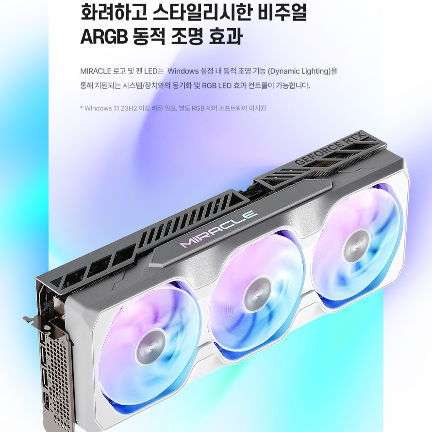 该显卡的风扇支持 0dB 低负载停转技术和 ARGB 灯效,侧面的 MIRACLE 标志也支持 ARGB。其显卡外壳正面尾部包含 1 个 USB Type-C,用户可通过该接口利用微软官方的 Dynamic Lighting 动态光效功能在 Windows 下实现照明同步,无需其它软件。