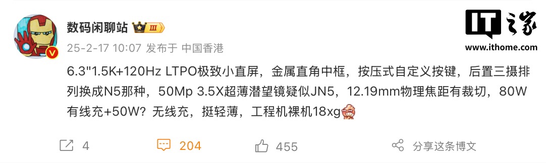 IT之家 2 月 17 日消息,博主 @数码闲聊站 今天公布一款 6.3 英寸神秘新机规格信息,该机将搭载 1.5K 120Hz LTPO 小直屏,配备金属直角中框,按压式自定义按键。