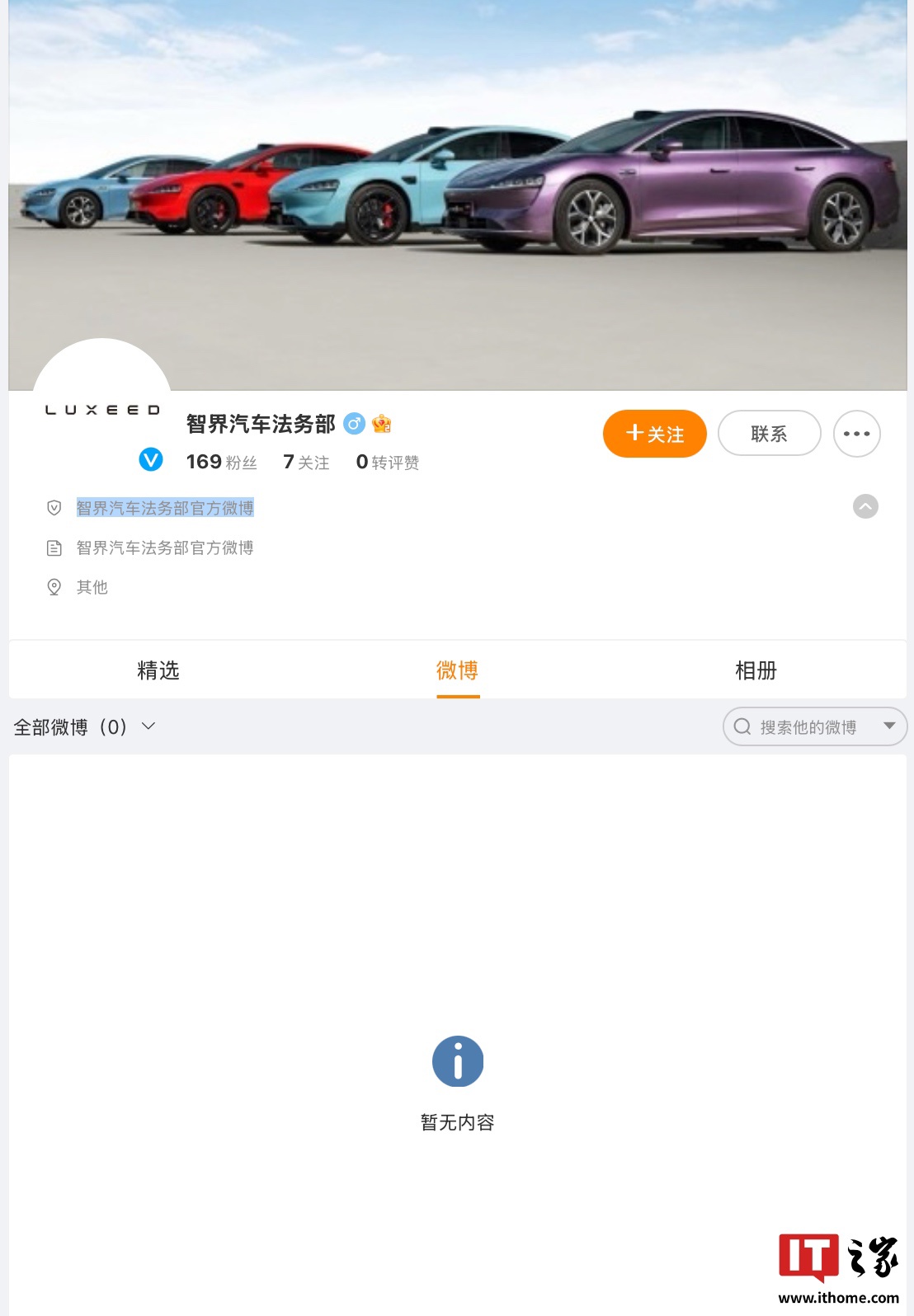 IT之家注意到,相应微博账号认证为“智界汽车法务部官方微博”,目前暂时没有发布任何微博内容。