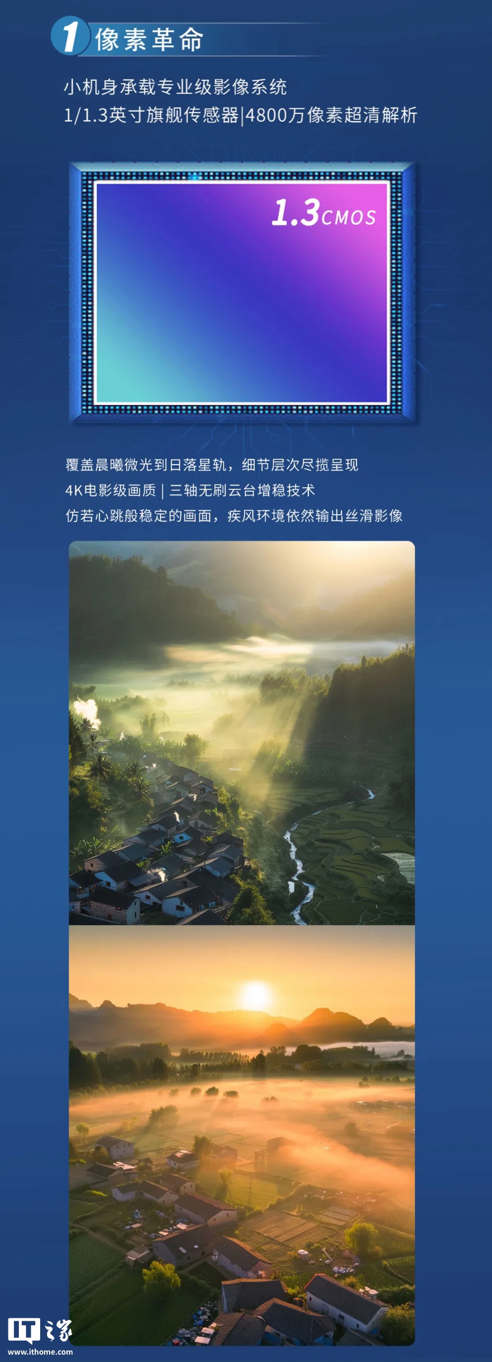 影像配置方面,该无人机搭载 1/1.3 英寸 48MP CMOS,2.4um 融合像素,配有 F1.85 光圈镜头,最高支持 4K 30 帧视频录制,配有三轴云台。