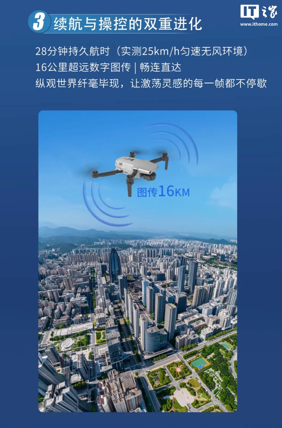 官方在宣传中强调该无人机重量 249 克,配有 3000mAh 电池,标称续航 28 分钟;搭载自研第三代飞控,以及第三代视觉跟踪技术,支持失速保护、低电返航等。