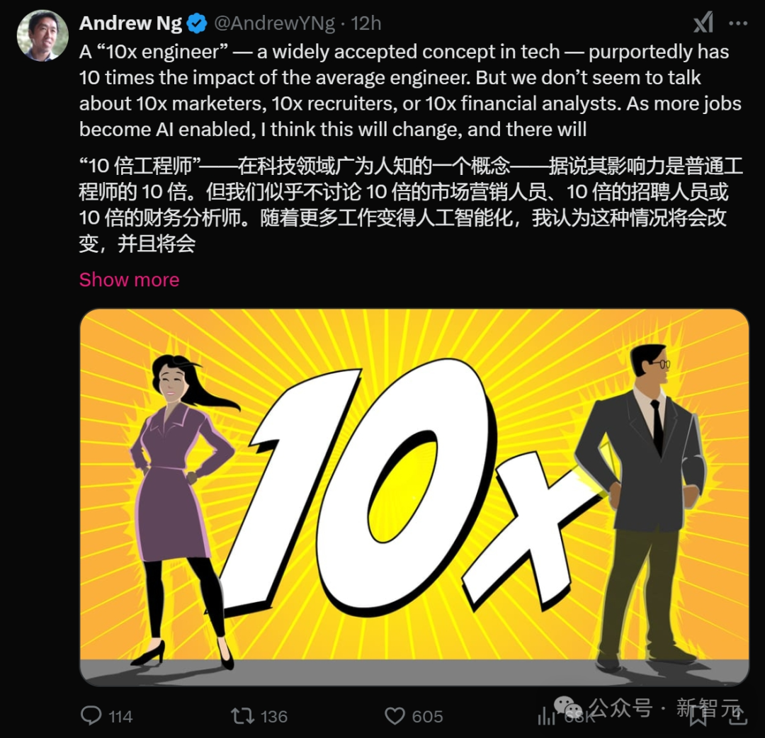 本文来自微信公众号:新智元(ID:AI_era),原标题《AI 时代如何避免被淘汰?吴恩达:成为职场「10 倍专业人士」》