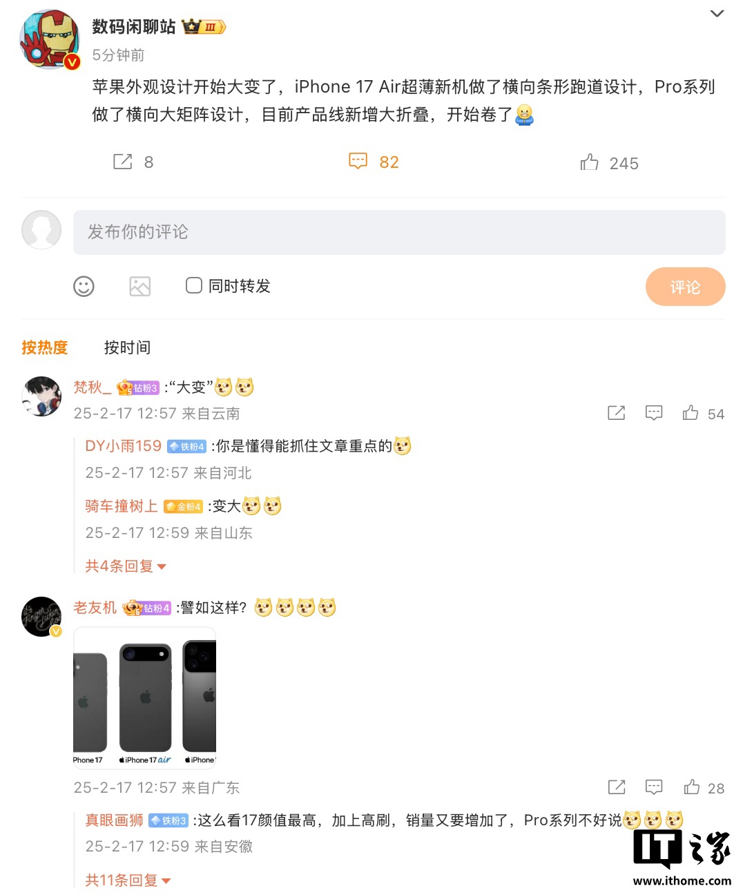 IT之家 2 月 17 日消息,博主 @数码闲聊站 发文透露“苹果外观设计开始有较大幅度调整”,其中“iPhone 17 Air 超薄新机做了横向条形跑道设计,Pro 系列做了横向大矩阵设计,目前产品线新增大折叠”。