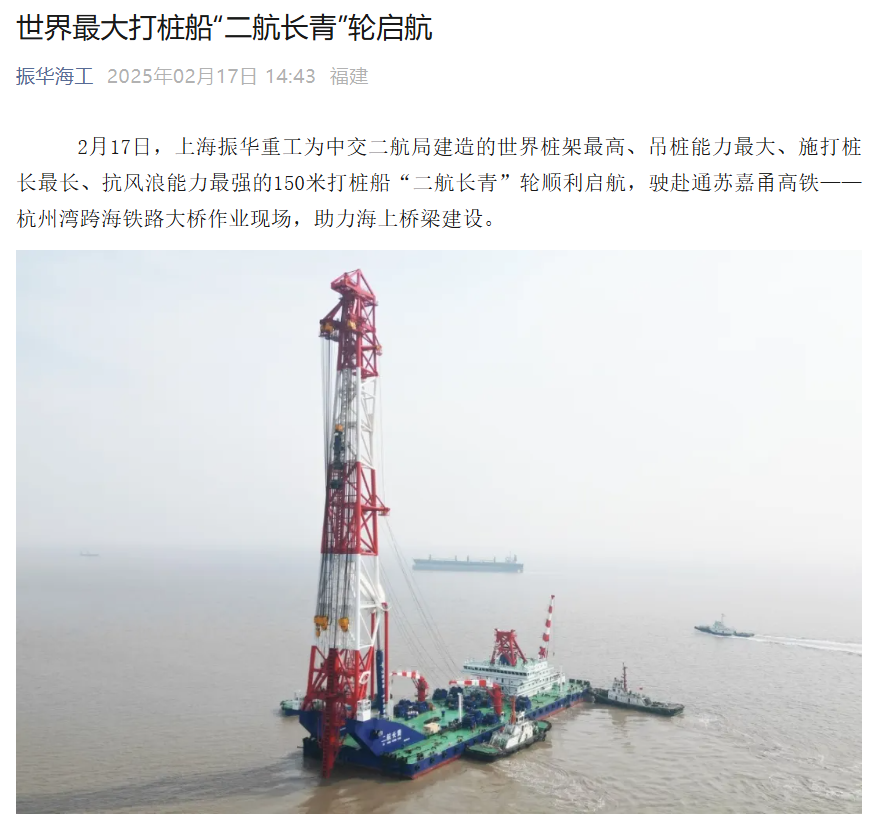 IT之家 2 月 17 日消息,据上海振华重工启东海洋工程股份有限公司消息,2 月 17 日上午,世界桩架最高、吊桩能力最大、施打桩长最长、抗风浪能力最强的 150 米打桩船“二航长青”轮顺利启航。该轮此次驶往苏嘉甬高铁 —— 杭州湾跨海铁路大桥施工现场,未来它还将在大型港口、跨海大桥、海上风电施工等工程建设中发挥作用。