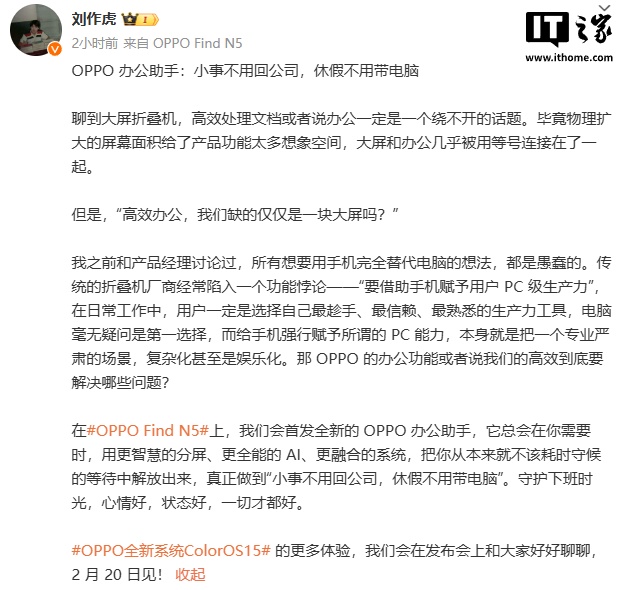 IT之家 2 月 17 日消息,OPPO 首席产品官、一加创始人刘作虎今日发文称,所有想要用手机完全替代电脑的想法,都是愚蠢的。OPPO 将在 OPPO Find N5 上,首发全新的 OPPO 办公助手。