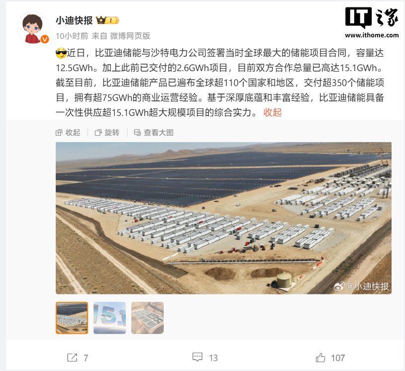IT之家 2 月 17 日消息,@小迪快报 今日在微博发文称,近日,比亚迪储能与沙特电力公司签署当时全球最大的储能项目合同,容量达 12.5GWh。加上此前已交付的 2.6GWh 项目,目前双方合作总量已高达 15.1GWh。