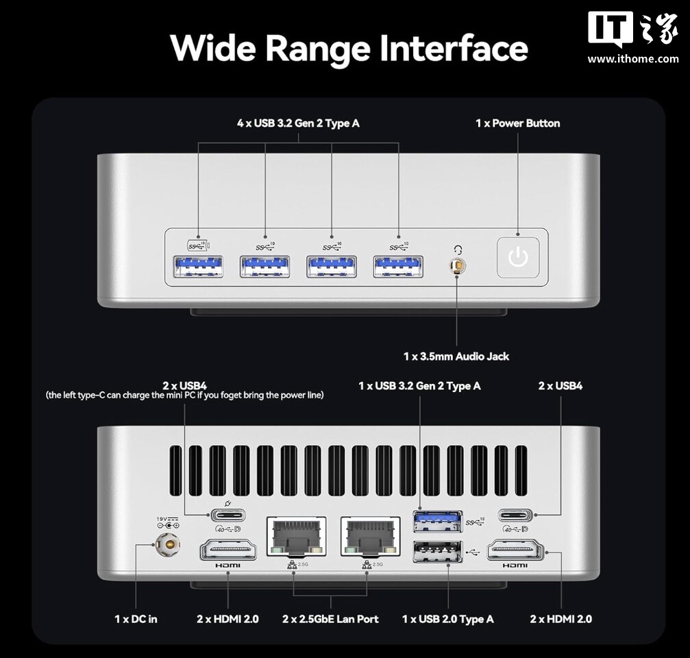 该机支持 WiFi 7 和蓝牙 5.4,正面配备 4 个 USB-A 3.2 Gen 2 接口、1 个 3.5mm 音频接口;背面配备 2 个 HDMI 2.0 接口、2 个 2.5G 网口、2 个 USB4 接口、2 个 USB-A 2.0 接口。