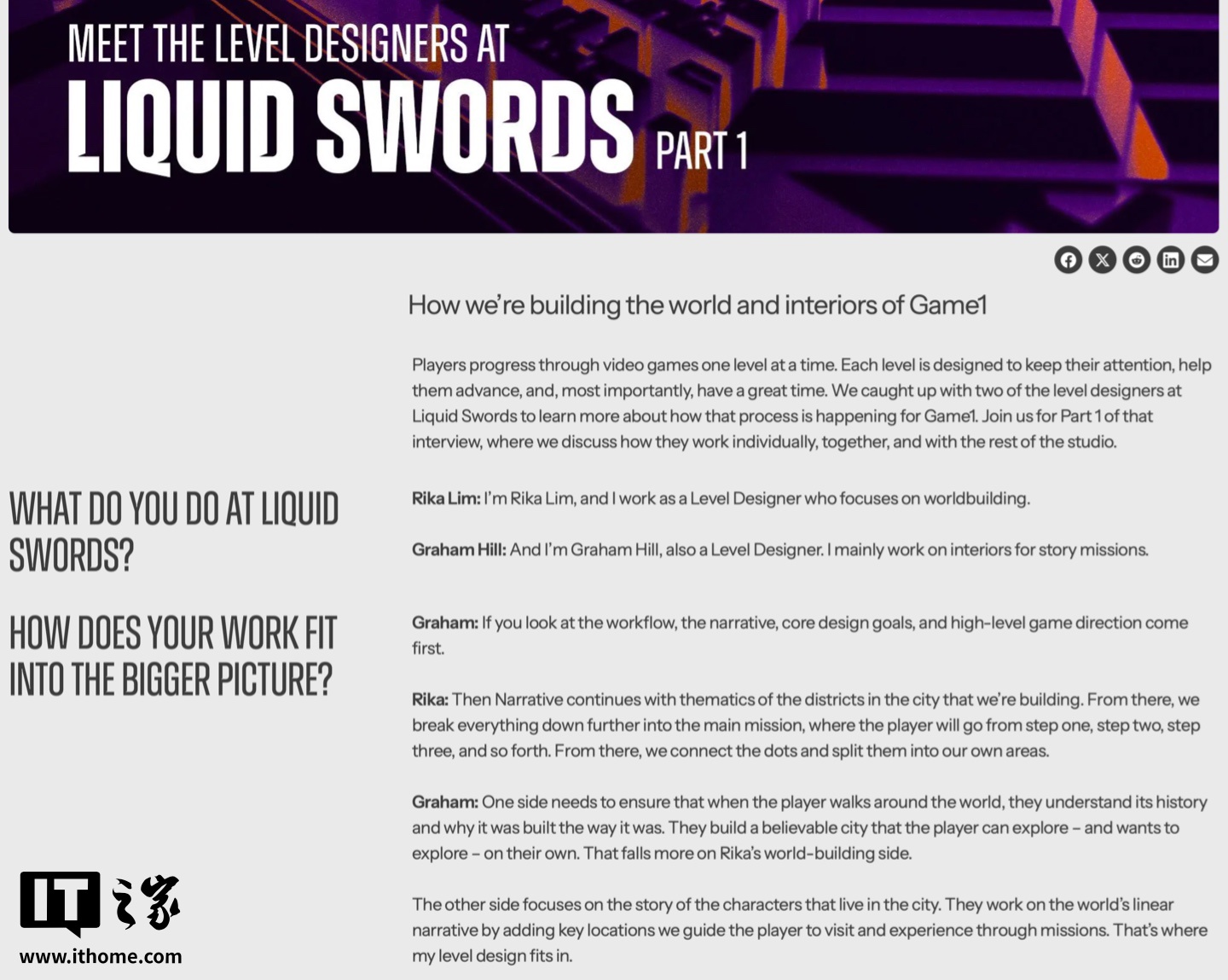 IT之家查询工作室官网,暂未找到具体游戏开发进度文字及图像,官网仅有刊载对于游戏开发者的采访,主要是开发者宣称“游戏的叙事、核心设计目标摆在首位”,没有透露任何细节。
