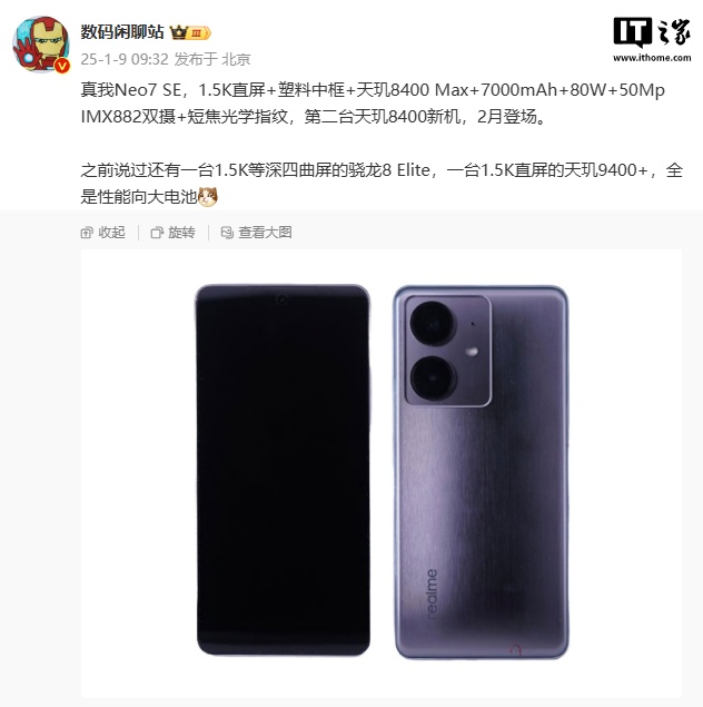 博主 @数码闲聊站 已曝光真我 Neo7 SE 手机的主要参数: