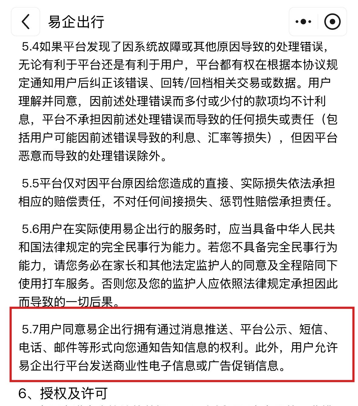 IT之家注意到,用户需要确认阅读并同意《易企出行使用协议》才能使用相应小程序,相关《协议》5.7 条款为“用户同意易企出行拥有通过消息推送、平台公示、短信、电话、邮件等形式向您通知告知信息的权利。此外,用户允许易企出行平台发送商业性电子信息或广告促销信息”。