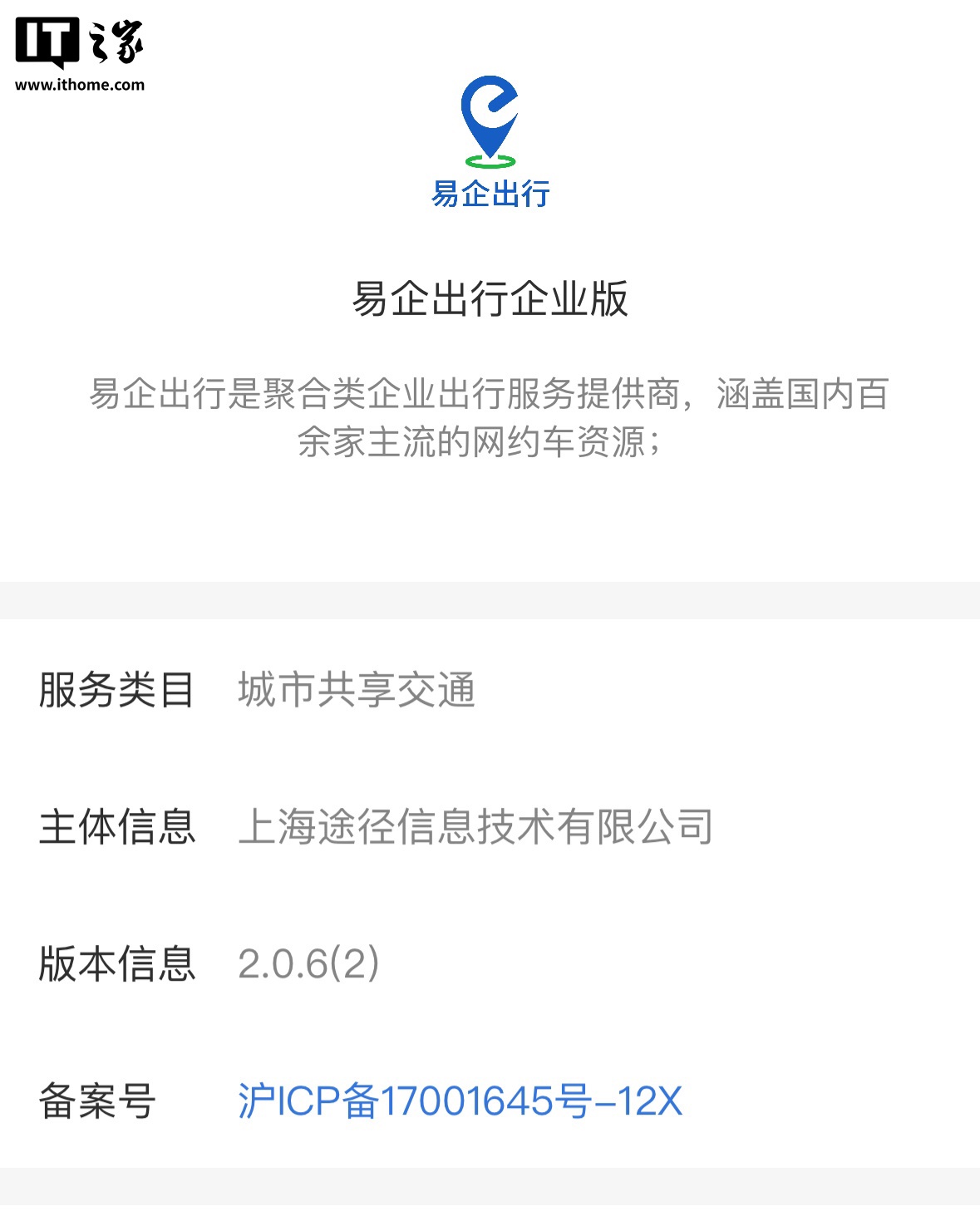 参考详情页,该小程序描述为“易企出行是聚合类企业出行服务提供商,涵盖国内百余家主流的网约车资源”,主体信息为“上海途径信息技术有限公司”。