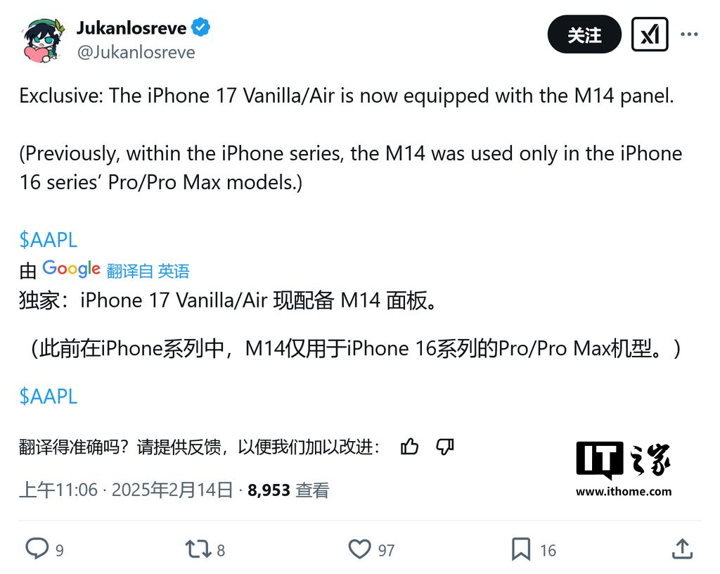最新消息称 iPhone 17、iPhone 17 Air、iPhone 17 Pro 和 iPhone 17 Pro Max 四款机型都将采用三星的 M14 OLED 面板,这意味着即使是入门级的 iPhone 17,也能拥有顶级的显示效果。