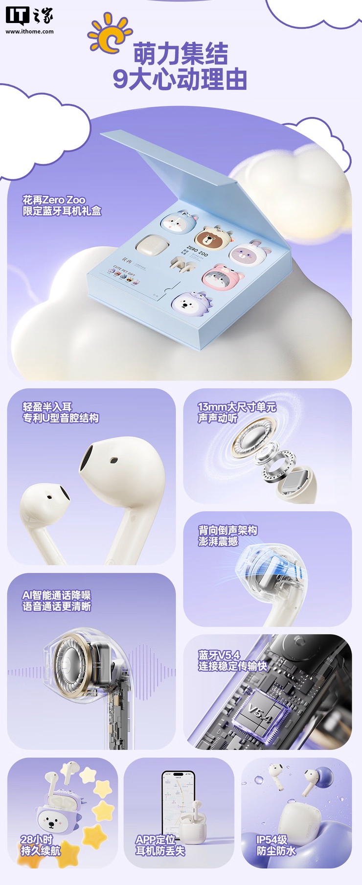 耳机本体方面,花再 Zero 无线蓝牙耳机采用半入耳设计,拥有 U 形音腔结构,单耳重量 3.2g,搭载 13mm 音频单元,支持蓝牙 5.4;耳机单次续航 7 小时,总续航 28 小时,支持 App 定位和 IP54 防尘防水。