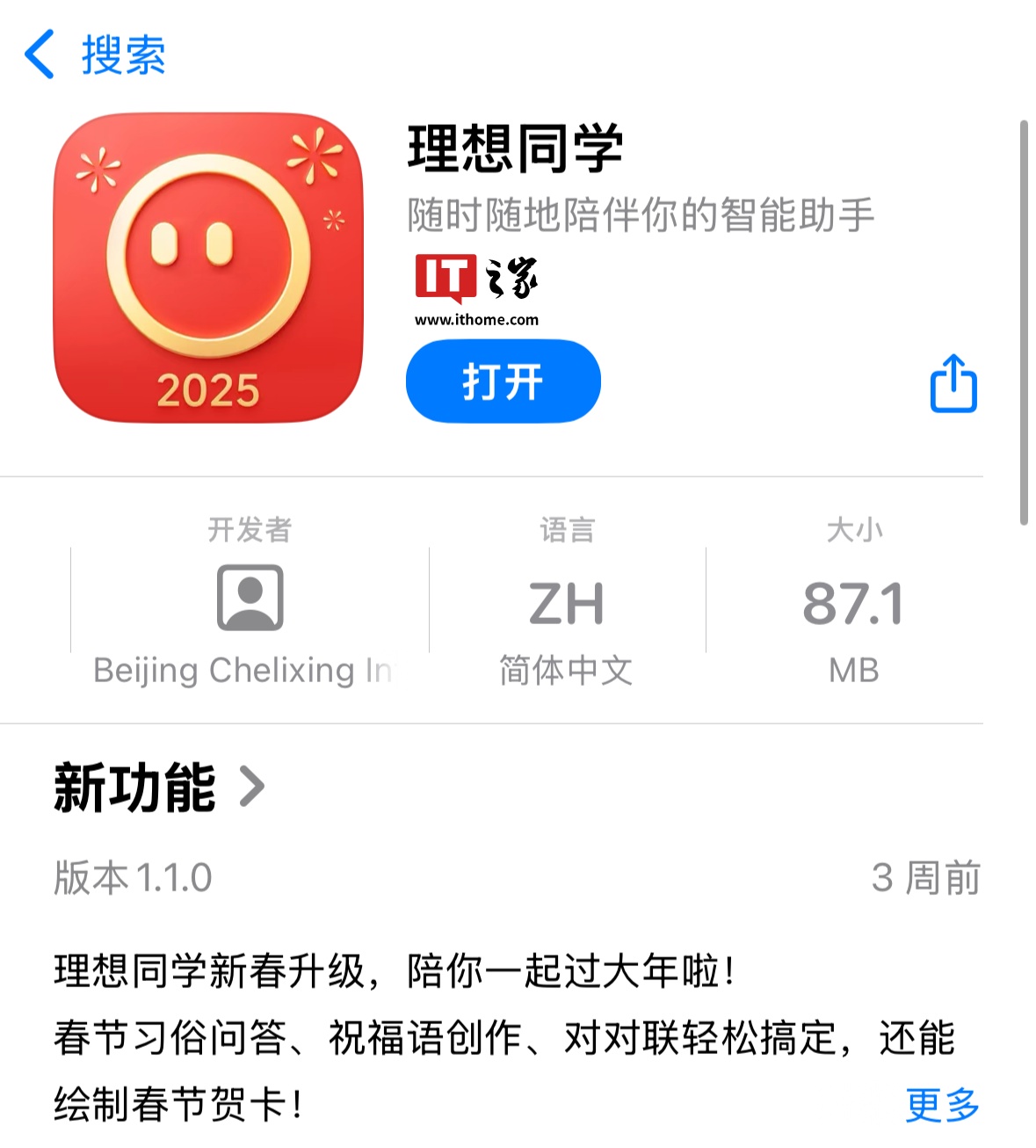 IT之家此前报道,理想同学 App 于去年 12 月上架苹果 App Store,该应用当前版本为 1.1.0(3 周前更新)、大小约 87.1MB,是由理想汽车依托自研大模型打造的人工智能应用。应用简介如下: