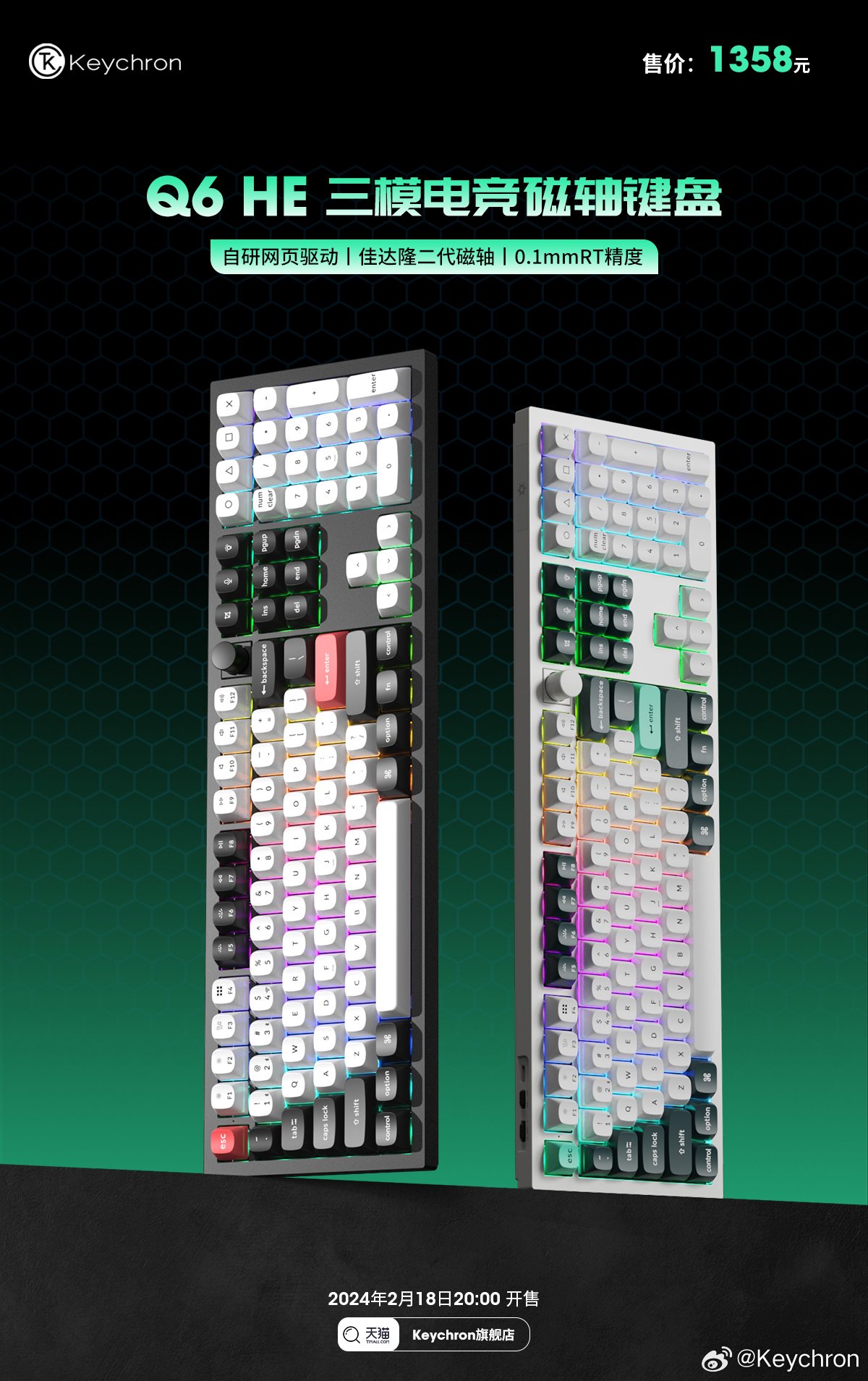 IT之家 2 月 18 日消息,Keychron Q6 HE 三模磁轴键盘今日正式发售,提供黑白两种配色可选,均为 1358 元。