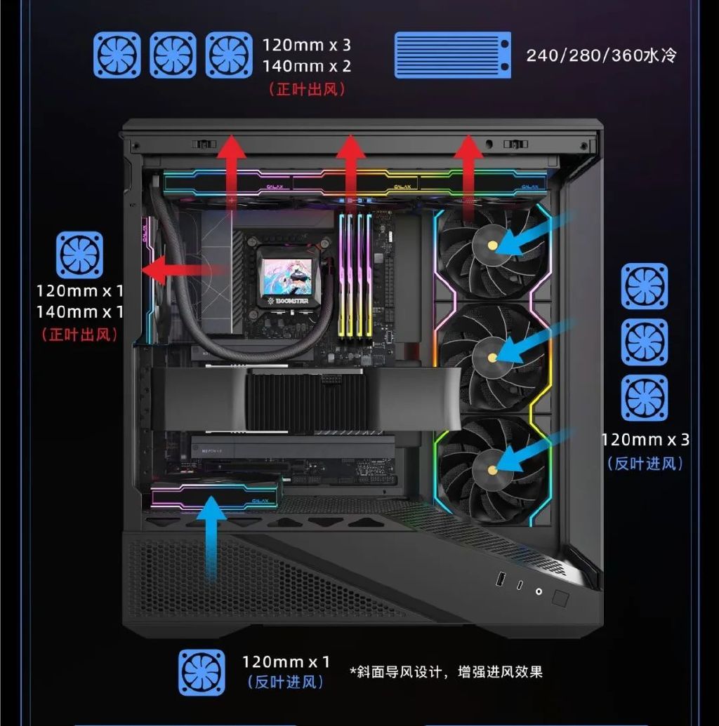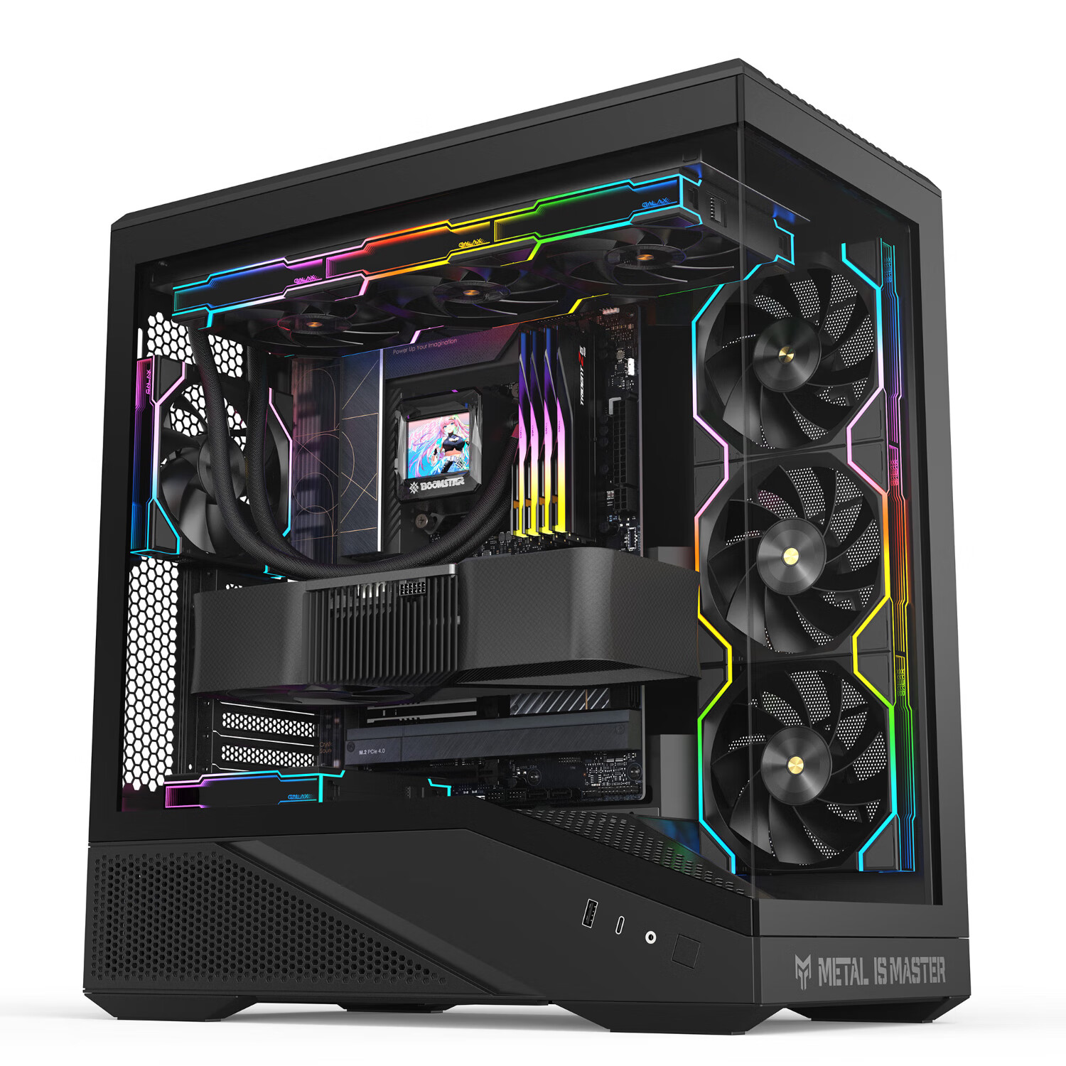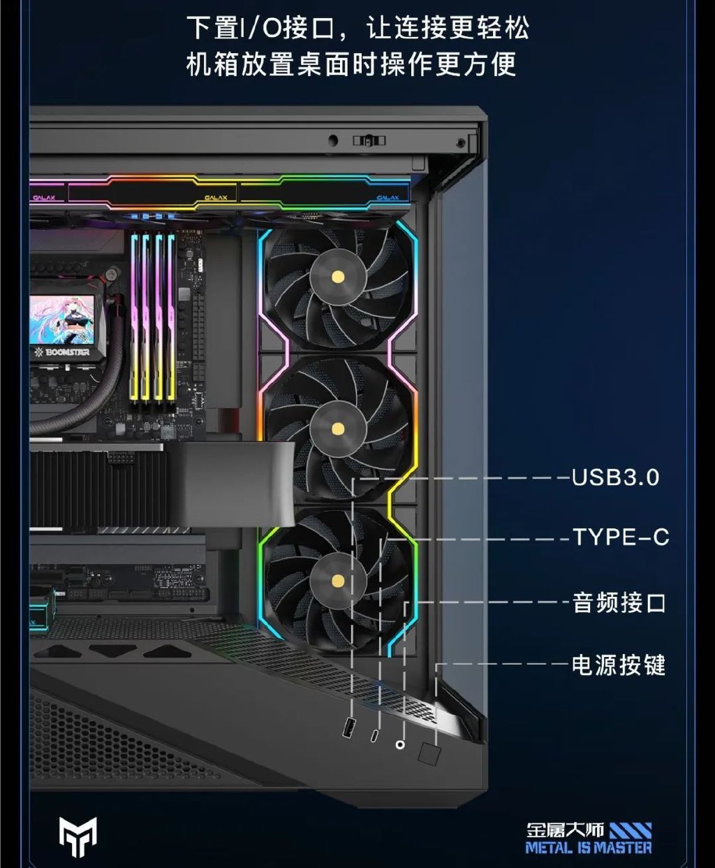 这款机箱延续了金属大师系列的几何线条语言设计,采用独特的斜边设计 + 侧面大面积钢化玻璃侧透设计;配备了经过反复测试的风道系统,最多可配置 8 枚高性能的散热风扇。