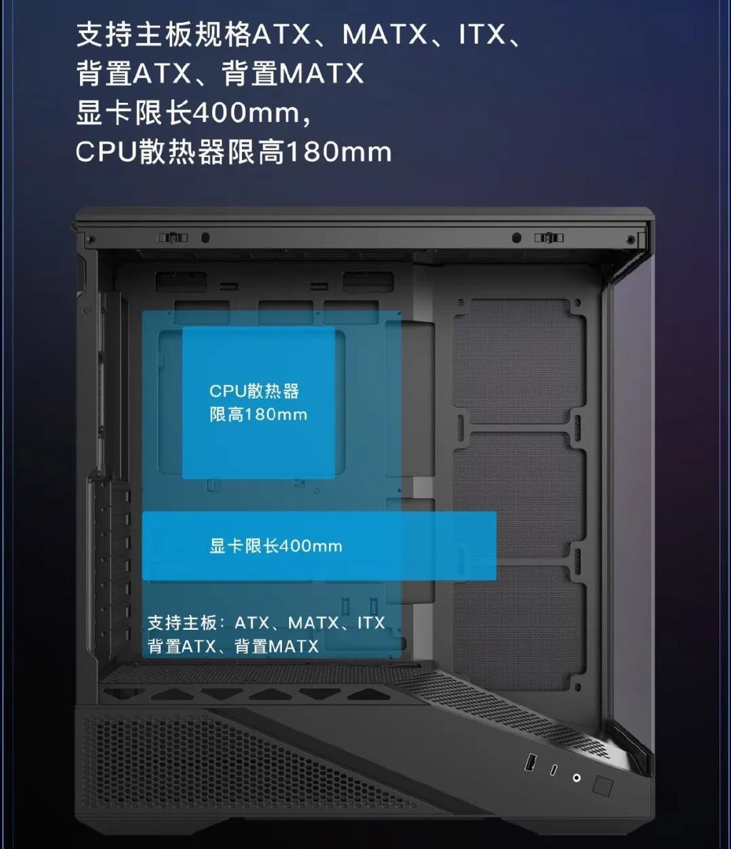 这款机箱能够兼容市面上主流规格的主板、显卡、电源等硬件,以及最新的 RTX 50 系显卡。同时,机箱内部预留了充足的走线空间,支持 ATX、MATX、ITX、背置 ATX、背置 MATX 主板。