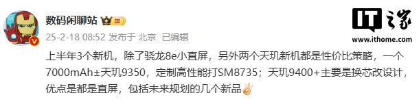 爆料显示,除了骁龙 8e 小直屏,另外两个天玑新机都是性价比策略。一个 7000mAh± 天玑 9350,定制高性能打 SM8735;天玑 9400 + 主要是换芯改设计,优点是都是直屏,包括未来规划的几个新品。