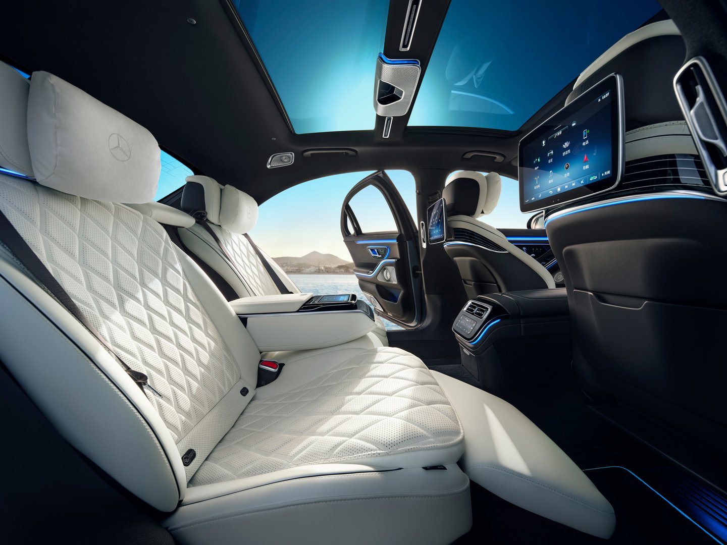 内饰方面,新车前排配备 12.3 英寸裸眼 3D 仪表屏、12.8 英寸 OLED 中控屏及 HUD 抬头显示,后排新增 7 英寸智能平板与双 11.6 英寸娱乐屏,支持隔空内容分享。新车还支持多区“读心语音助理”,可识别后排指令,MBUX 智能感应系统通过摄像头预判 20 余项功能(如自动开启遮阳板)。