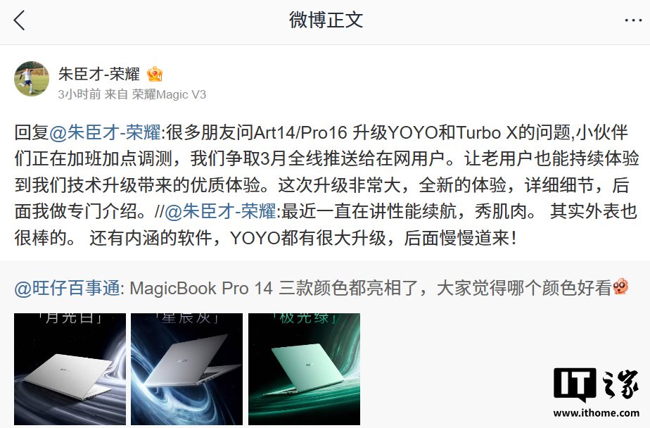 IT之家注意到,荣耀 PC 产品线总经理 @朱臣才-荣耀 今日发文确认,荣耀 MagicBook Art 14 / Pro 16 笔记本将获 YOYO、Turbo X 升级,争取 3 月全线推送给在网用户。