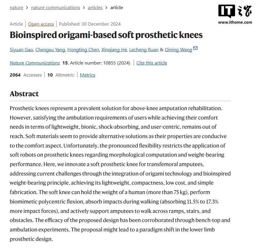 这一创新假肢是国际首款软体膝关节假肢,为下肢假肢的设计提供了全新的思路。IT之家查询发现,相关研究成果已于 2024 年 12 月 30 日发表于《Nature Communications》上。