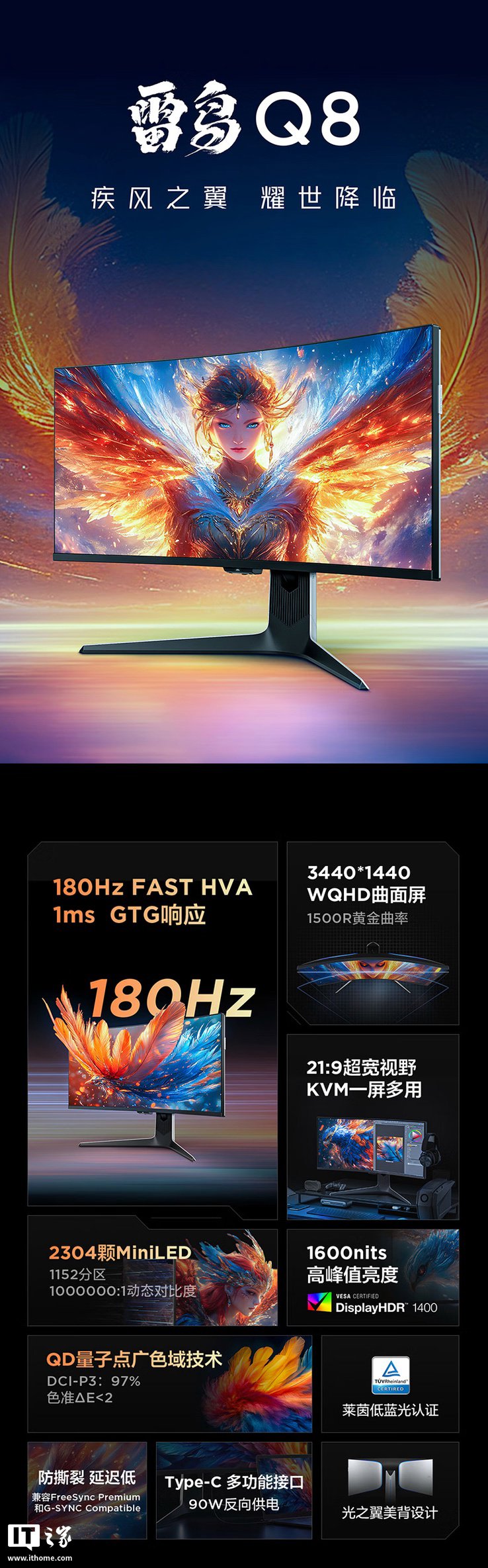 IT之家 2 月 19 日消息,雷鸟旗下“Q8 特别版”34 英寸带鱼屏显示器现已在京东开启首销,这款显示器主打“1440P 180Hz Mini LED”,定价为 3299 元。