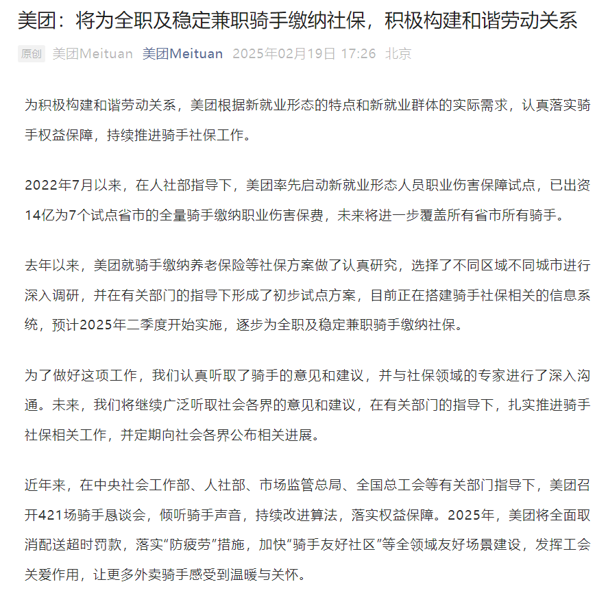去年以来,美团就骑手缴纳养老保险等社保方案做了认真研究,选择了不同区域不同城市进行深入调研,并在有关部门的指导下形成了初步试点方案,目前正在搭建骑手社保相关的信息系统,预计 2025 年二季度开始实施,逐步为全职及稳定兼职骑手缴纳社保。