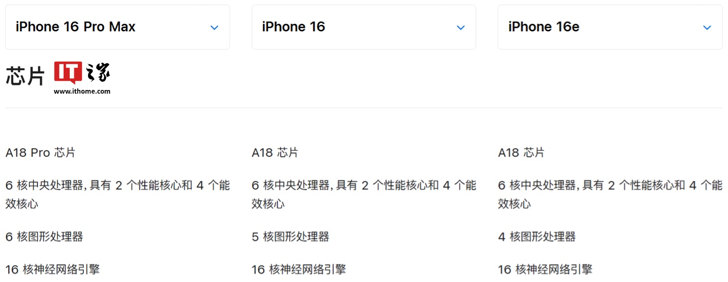 IT之家注意到,iPhone 16e 在处理器规格上与 iPhone16 标准版有所区别,其使用的 A18 芯片配备 4 核图形处理器,而 iPhone 16 标准版则搭载配备了 5 核图形处理器的 A18 芯片(其他规格一致)。