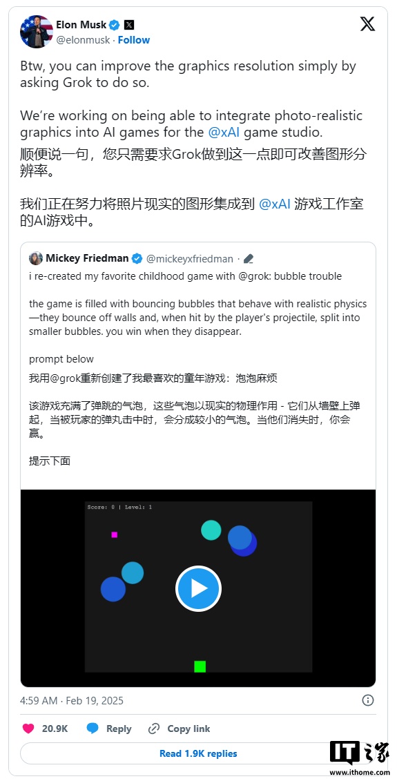 IT之家注意到,马斯克在回应上述用户的推文时表示,xAI 的新游戏工作室正在研究如何将“照片级真实感图形”融入 AI 游戏中。此外,他还声称 Grok 3 可以通过提示语言模型来提升游戏的图形分辨率。目前尚不清楚这一功能是否仅限于由 Grok 3 生成的游戏,还是会作为一种独立技术推出,类似于英伟达的 DLSS 超分辨率或 AMD 的 FidelityFX 超分辨率技术。