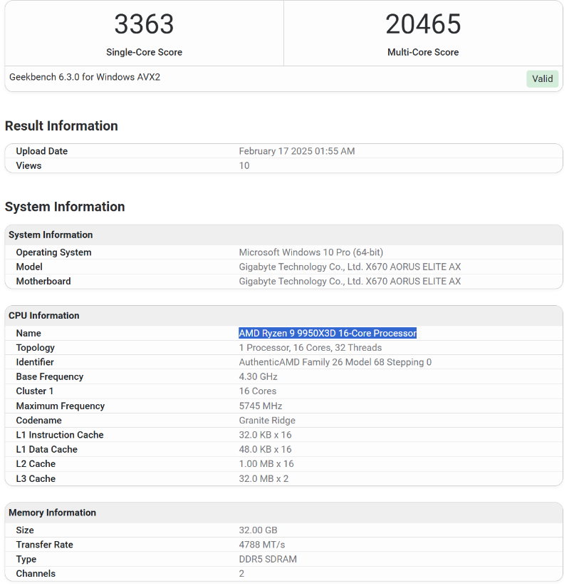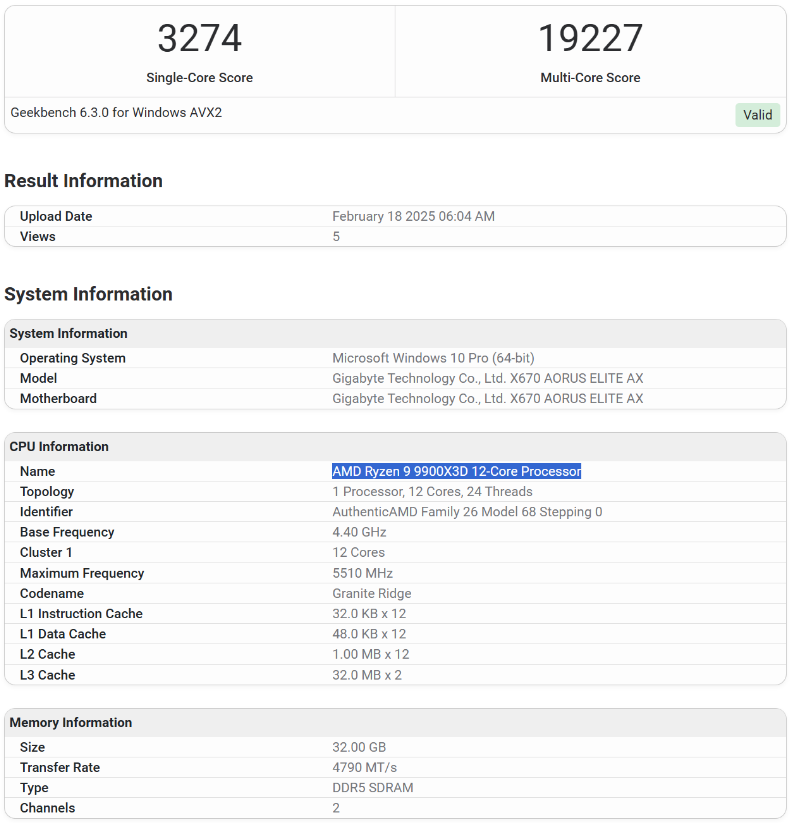 两款处理器均在技嘉 X670 AORUS Elite AX 主板上进行测试,并搭配了 32GB DDR5-4800 内存。9900X3D 在 Geekbench 6.3 的单核和多核测试中分别获得了 3274 和 19227 分。9950X3D 获得了 3363 和 20465 分。