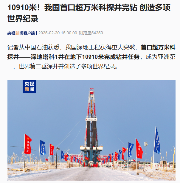 IT之家 2 月 20 日消息,据央视报道,我国在深地工程领域取得了重大突破,中国石油成功完成了首口超万米的科探井 —— 深地塔科 1 井的钻探任务。