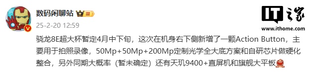 IT之家 2 月 20 日消息,博主 @数码闲聊站 今日爆料称某厂骁龙 8 至尊版超大杯暂定 4 月中下旬,据评论区网友推测,该机预计为 vivo X200 Ultra。