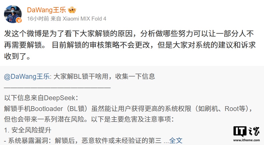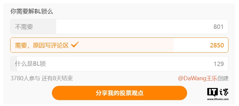 IT之家 2 月 20 日消息,小米公司应用软件部总监王乐昨日在微博向用户征集了解锁 BL 锁用途等相关信息,并发起投票,目前结果如下: