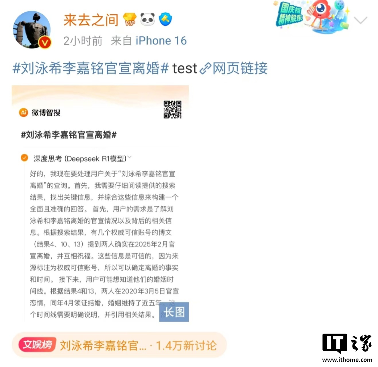 IT之家 2 月 20 日消息,微博 CEO 王高飞(@来去之间 )今日分享了多条微博智搜内容,该功能已经接入深度思考(DeepSeek R1 模型),目前处于测试阶段。