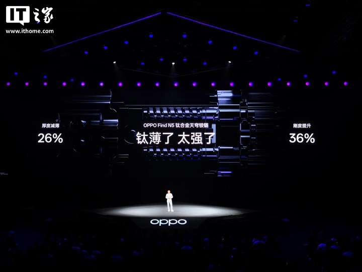 IT之家 2 月 20 日消息,OPPO Find N5 及 WatchX2 旗舰新品发布会正在进行中,目前 Find N5 已正式亮相。新机搭载钛合金天穹铰链,采用航天级钛合金 3D 打印技术。铰链最薄零件仅有 0.15mm,和头发直径相当。铰链整体减薄 26% 的同时,让刚度提升 36%。