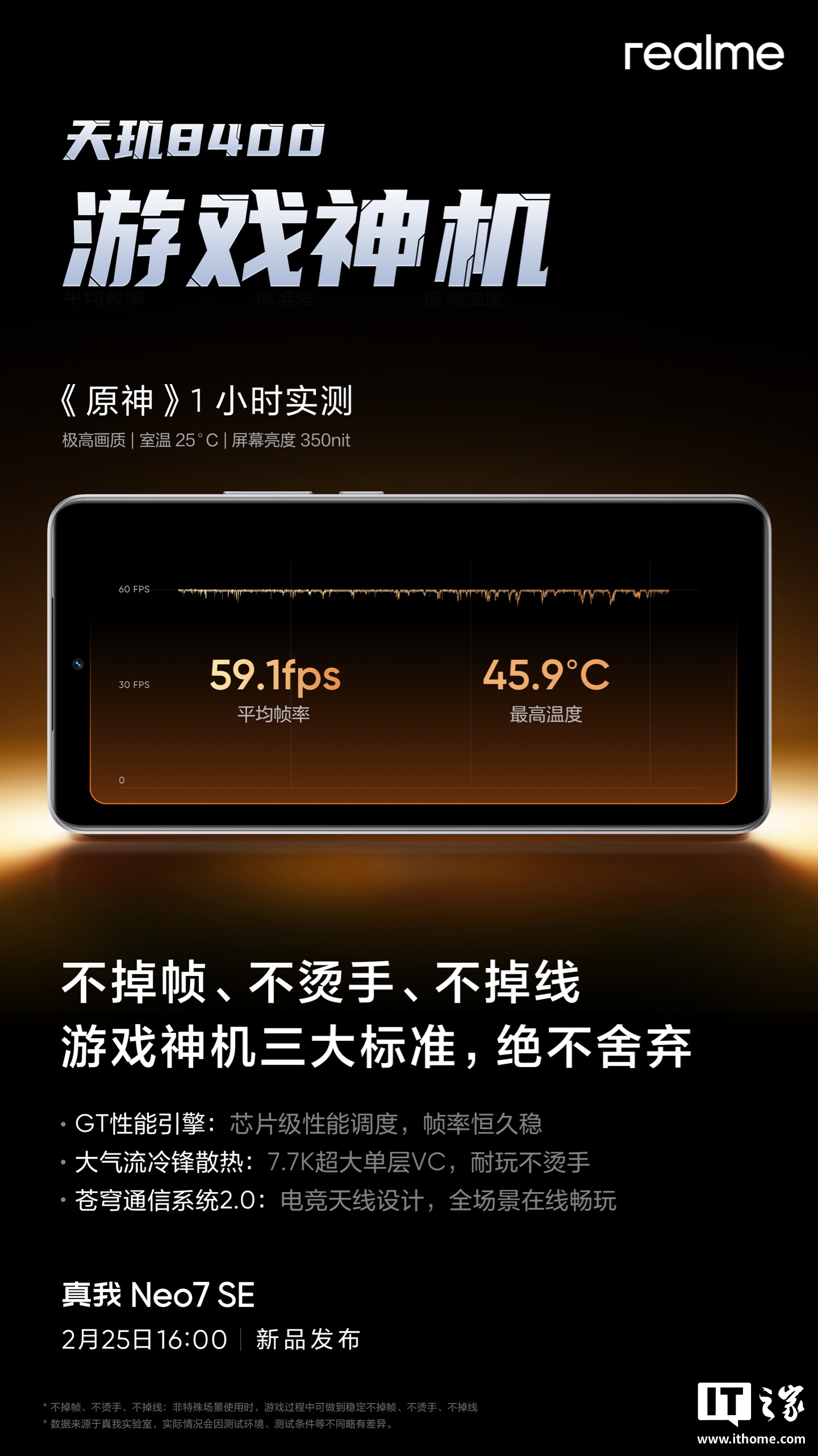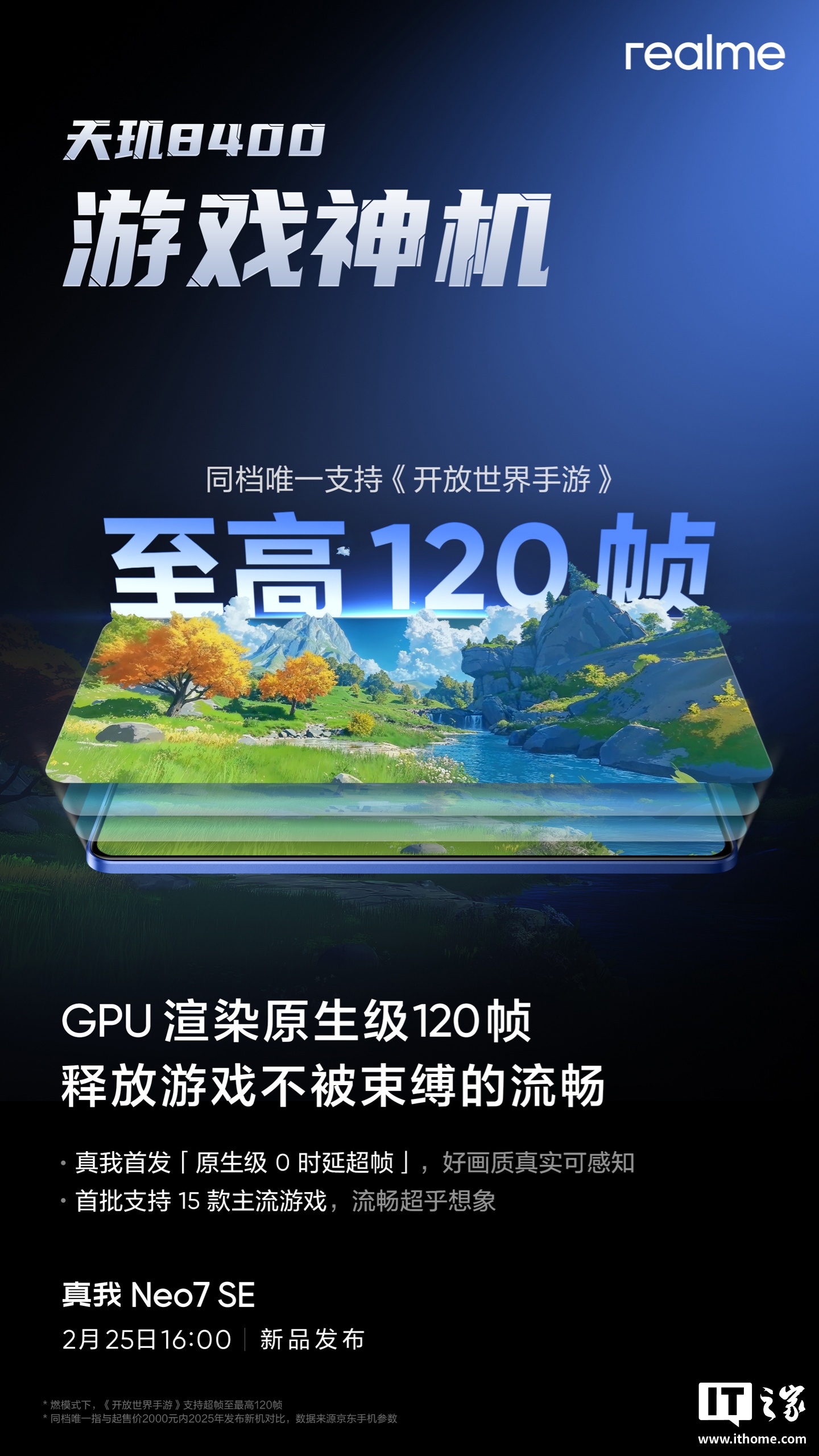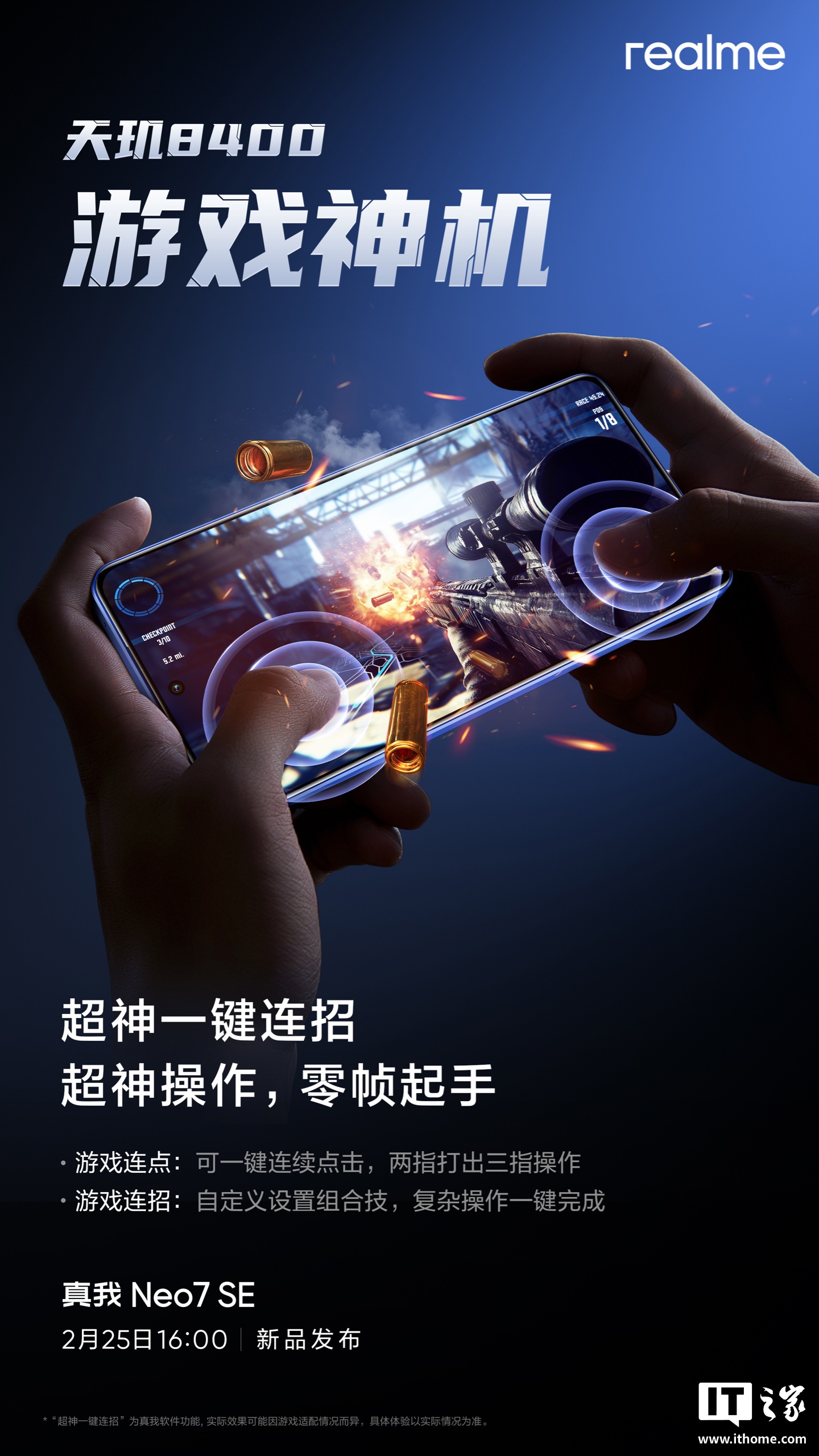IT之家 2 月 20 日消息,realme 真我 Neo7 SE 手机将于 2 月 25 日 16:00 发布,新机搭载联发科天玑 8400-Max 处理器,将行业首发游戏功能接入 DeepSeek-R1。