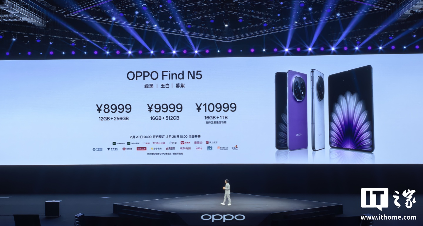 IT之家 2 月 20 日消息,OPPO Find N5 今晚迎来发布,在介绍完 OPPO Watch X2 智能手表之后,价格信息也正式公布: