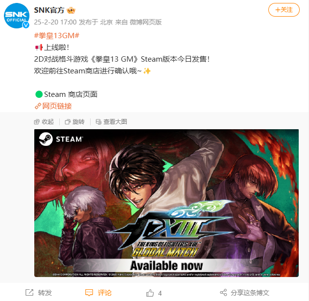 IT之家 2 月 20 日消息,2D 对战格斗游戏《拳皇 13 GM》(GM 即 GLOBAL MATCH,全球对战版)Steam 版本今日发售,相比原版主要是添加了回滚代码,使在线对战更流畅。