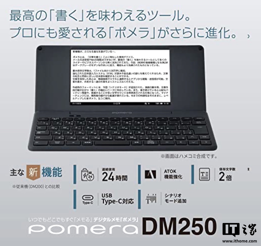 IT之家 2 月 21 日消息,日本文具制造商 King Jim 宣布为旗下 Pomera DM250“便携式数字打字机”推出全球版本(日本版 2022 年发布),该机整体类似当年的文曲星等电子学习机,只能用于打字和简单管理文件,定价为 499 美元(当前约 3634 元人民币),首发价为 349 美元(IT之家备注:当前约 2542 元人民币)。