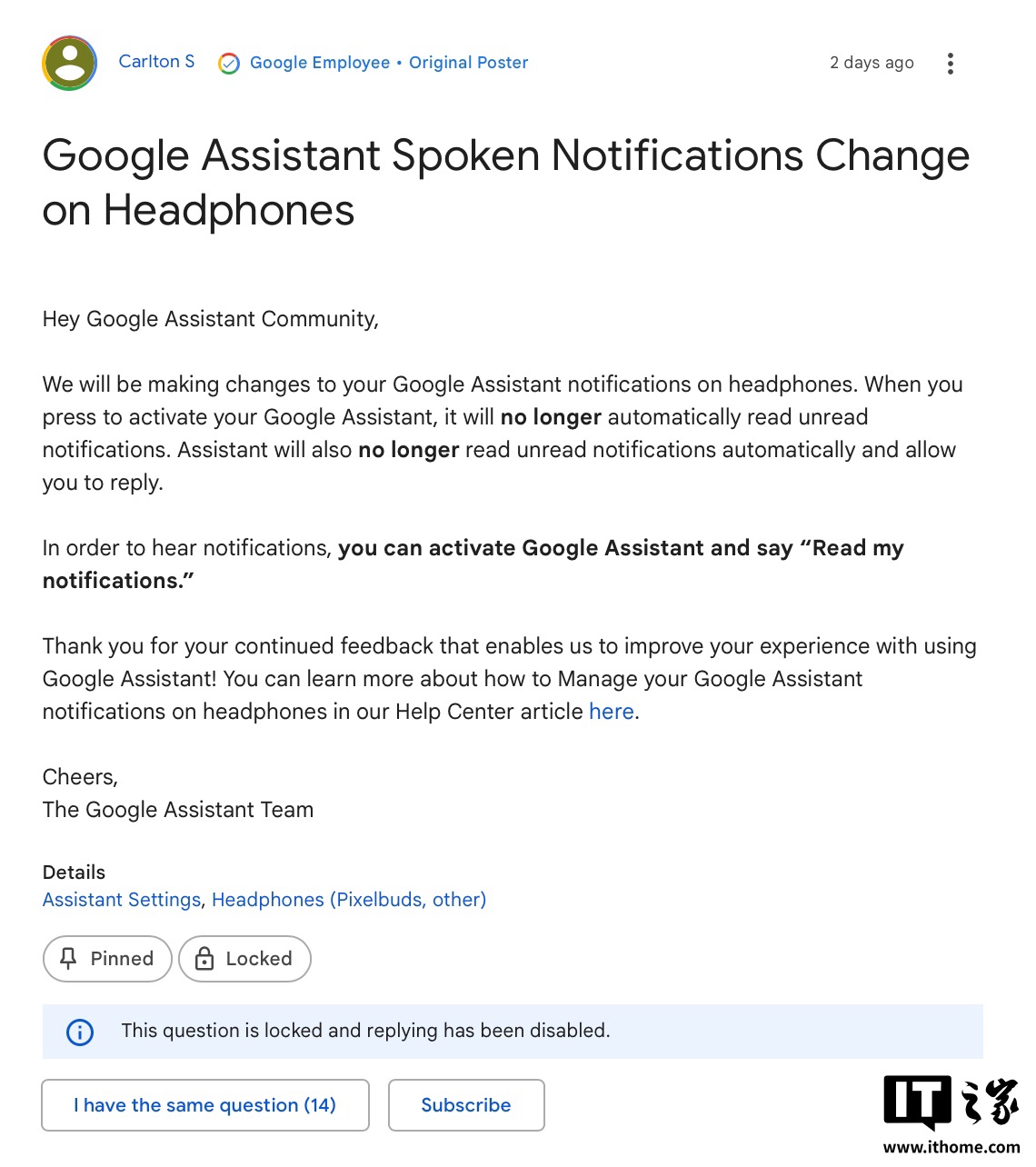 IT之家 2 月 21 日消息,谷歌发文,宣布砍掉所有支持 Google Assistant 语音助理的耳机通过触控唤醒助理“朗读设备历史通知内容”的功能,如果用户要让语音助理朗读设备通知内容,就必须通过喊“Hey,Google”以语音方式要求助理读出通知。