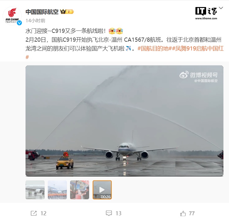 IT之家 2 月 21 日消息,国产大飞机 C919 商业航班首次落地温州,据中国国际航空官方消息,2 月 20 日,国航 C919 开始执飞北京-温州 CA1567/8 航班。
