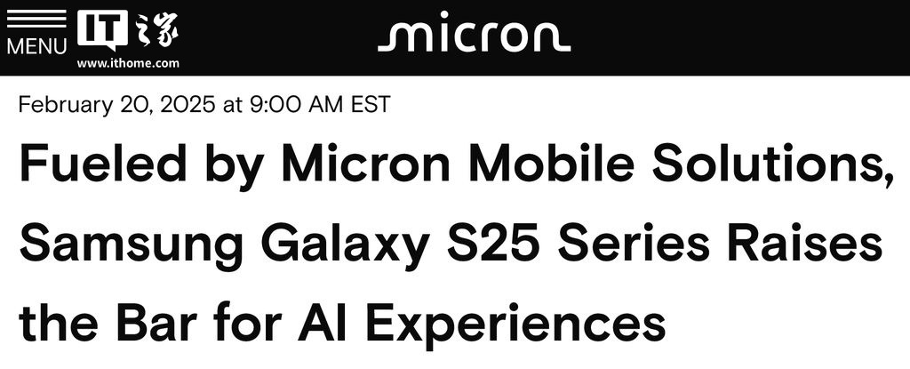 IT之家曾于今年 1 月报道,有消息称美光打破历史,拿下三星 Galaxy S25 系列手机内存一供,而现在美光在官方新闻稿中,明确指出包括 Galaxy S25 Ultra、S25 + 和 S25 在内,三星 Galaxy S25 系列采用美光领先的 LPDDR5X 内存和 UFS 4.0 存储。