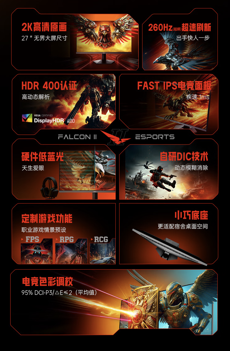 这款显示器配备 2560x1440 分辨率 260Hz(超频,实际为 240Hz)Fast IPS 面板,典型亮度 350 尼特,HDR 峰值亮度 400 尼特,静态对比度 1000:1,GtG 响应速度 1ms,支持 8-Bit 色彩,覆盖 95% DCI-P3 色域。