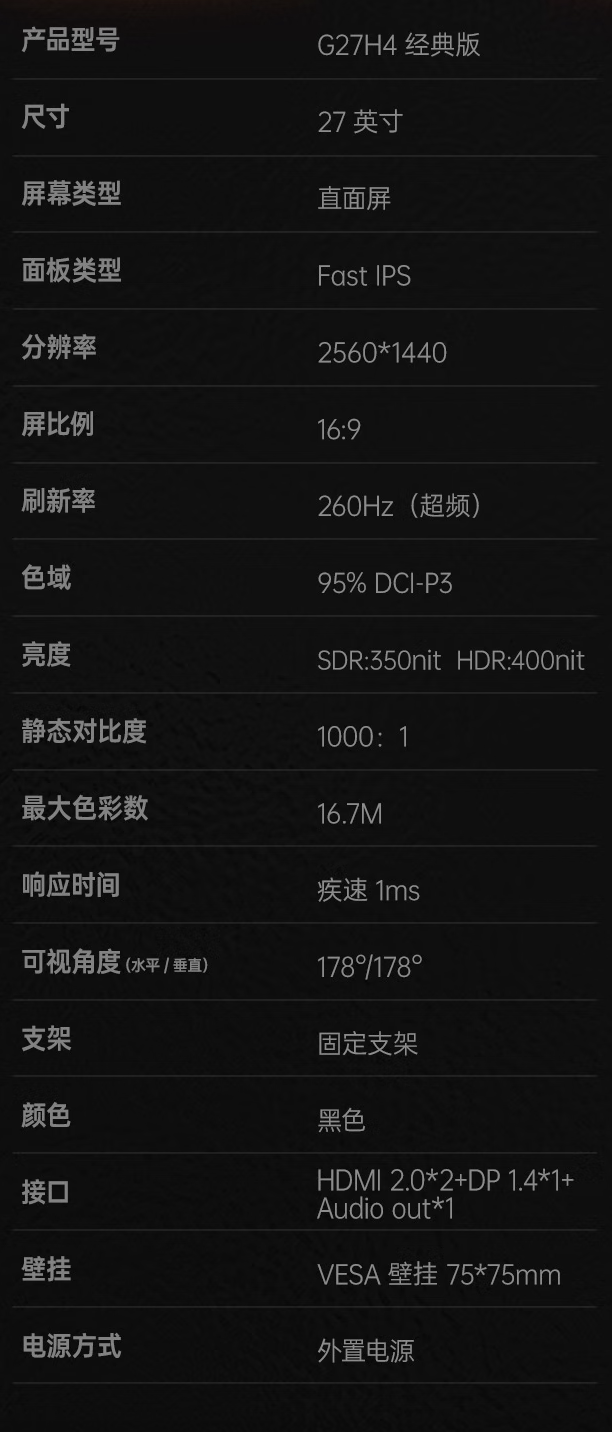 这款显示器支架不支持调节,不过显示器支持 75x75mm 壁挂,提供 2 个 HDMI 2.0、1 个 DP 1.4、1 个 3.5mm 音频接口。