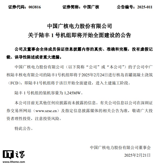 中国广核今晚发布公告,子公司中广核陆丰核电有限公司的陆丰 1 号机组将于 2025 年 2 月 24 日进行核岛首罐混凝土浇筑(FCD),即开始全面建设,进入土建施工阶段。